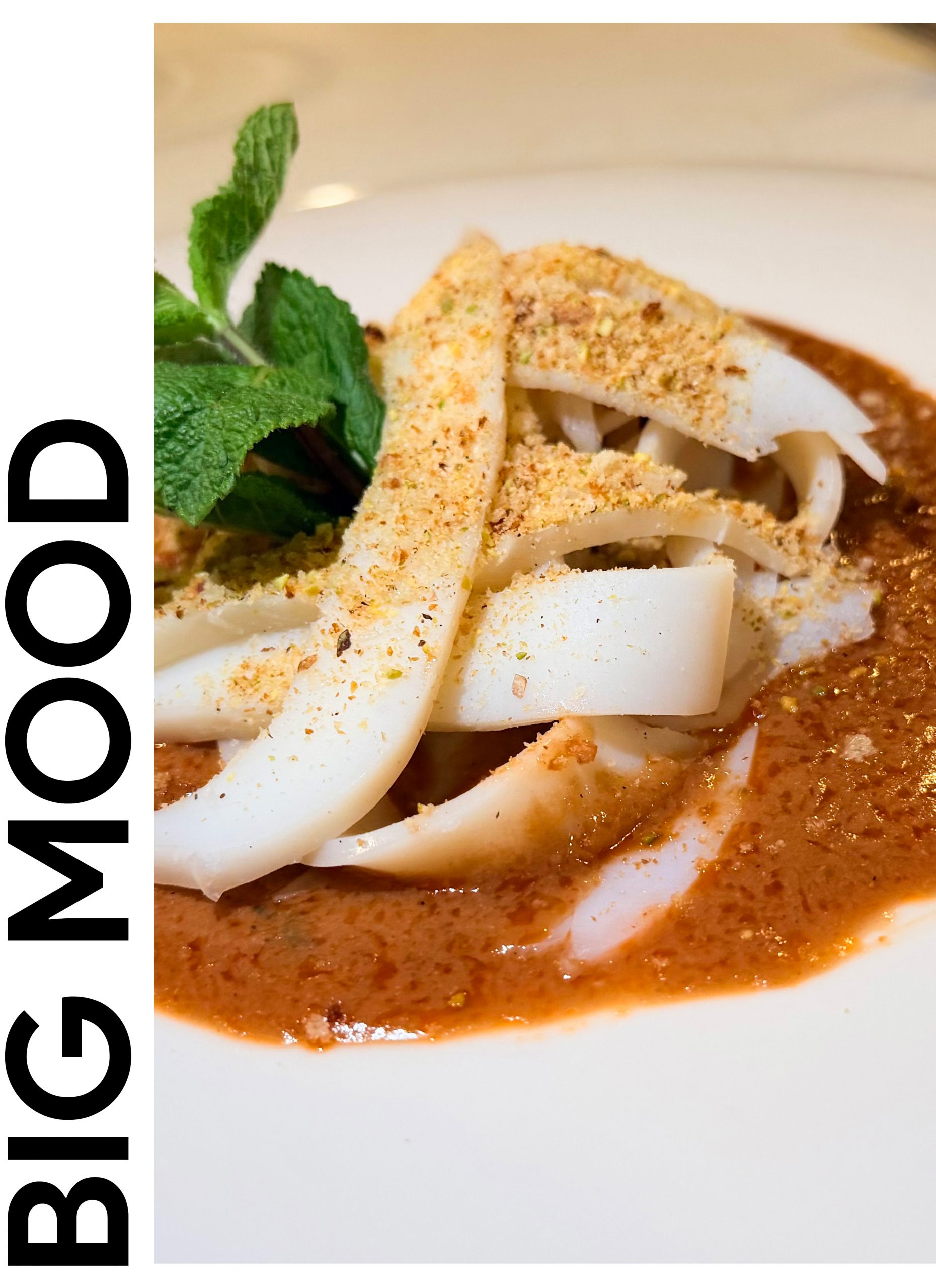 Questa tagliatella di seppia nasce da un contrasto elegante: sotto, una riduzione intensa di gambero rosso, profonda, quasi viscerale, che concentra il mare in una carezza densa e avvolgente. Sopra, la seppia si presenta per quello che è: pura, essenziale, bianca e delicata. Il croccante del pane aromatizzato rompe il ritmo, aggiunge memoria e materia. La menta, appena accennata, non invade: rinfresca, apre e pulisce. È un piatto che gioca sull’equilibrio, non sull’eccesso. Ed è proprio lì che diventa interessante. Un piccolo esercizio di sottrazione. Un piatto che resta.